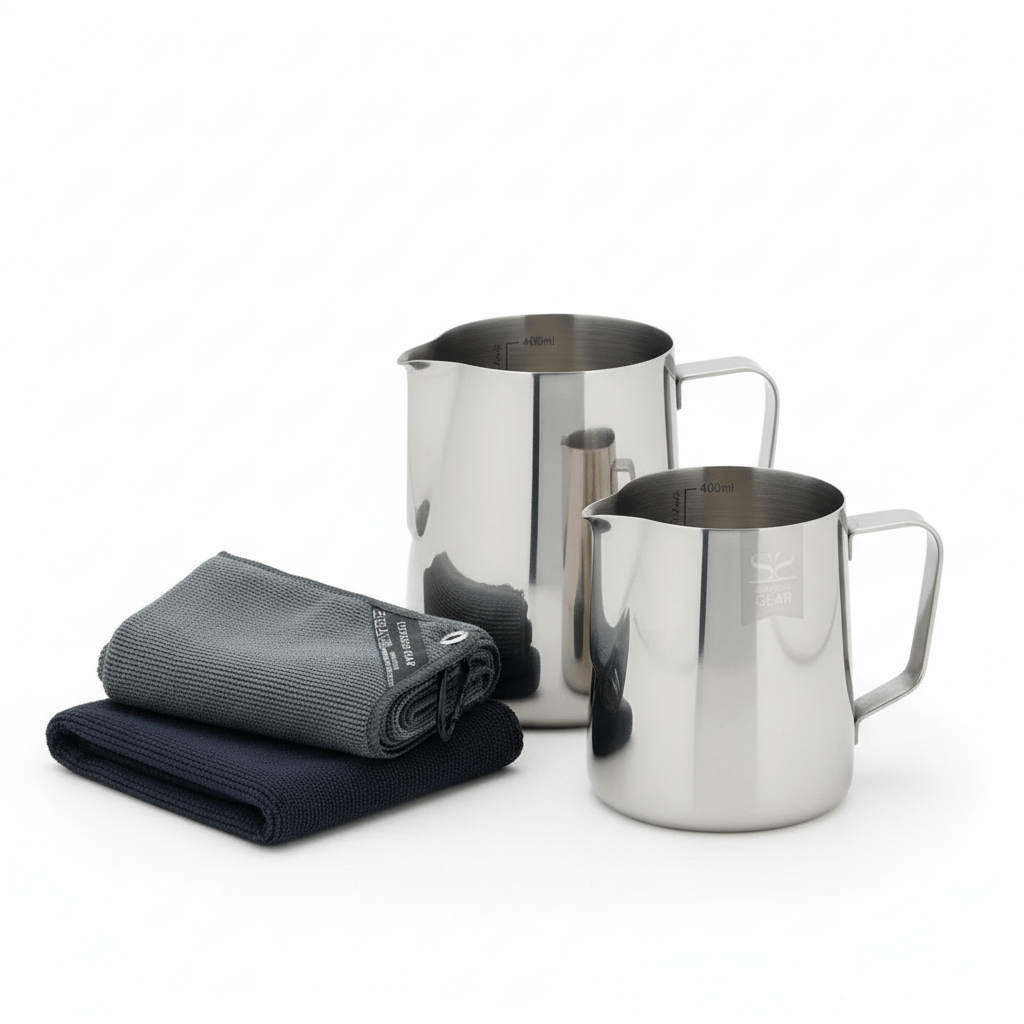 Barista Startpakiet - 2 dzbanki do mleka & 3 ściereczki baristyczne