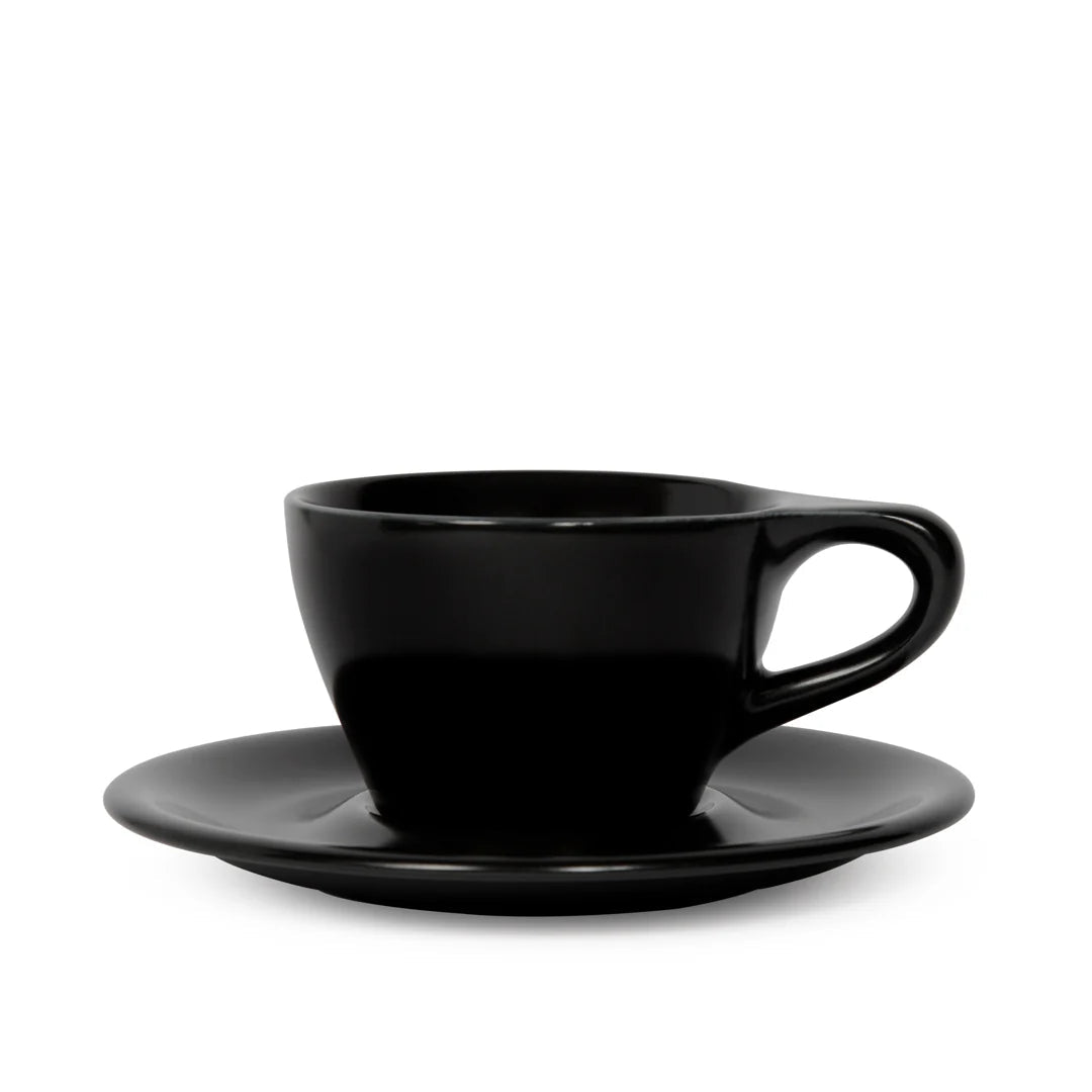 Baristycznie zatwierdzony kubek do cappuccino z matowej czarnej porcelany. Zaprojektowany we współpracy z nagradzanymi baristami dla optymalnego przepływu mleka, idealnej latte art i profesjonalnego odczucia w każdej filiżance.