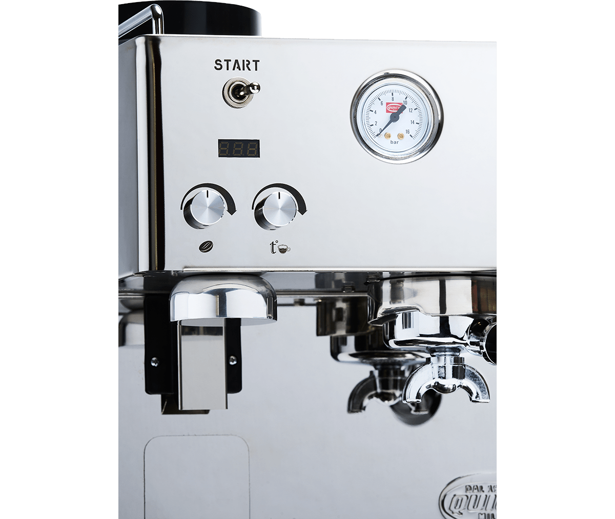 Kontrole: PID; manometr pompy 0–16 bar; wyświetlacz (temp, timer strzału); zawór profilujący; programowalny tryb czuwania; przełączniki dźwigniowe; lampki kontrolne; wbudowany tamper; przycisk regulacji temperatury