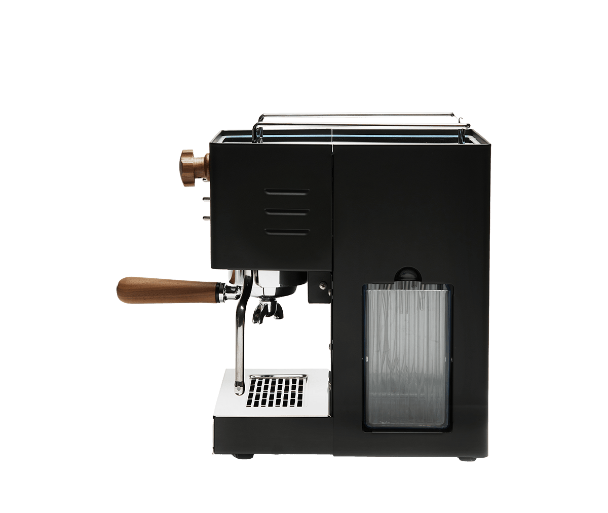 Obudowa i zewnętrzne elementy wykonane są ze stali nierdzewnej. Ekspres dostępny jest także w wersji matowej czarnej z pokrętłem pary i portafiltrem z drewna — idealny dla miłośników nowoczesnego designu.