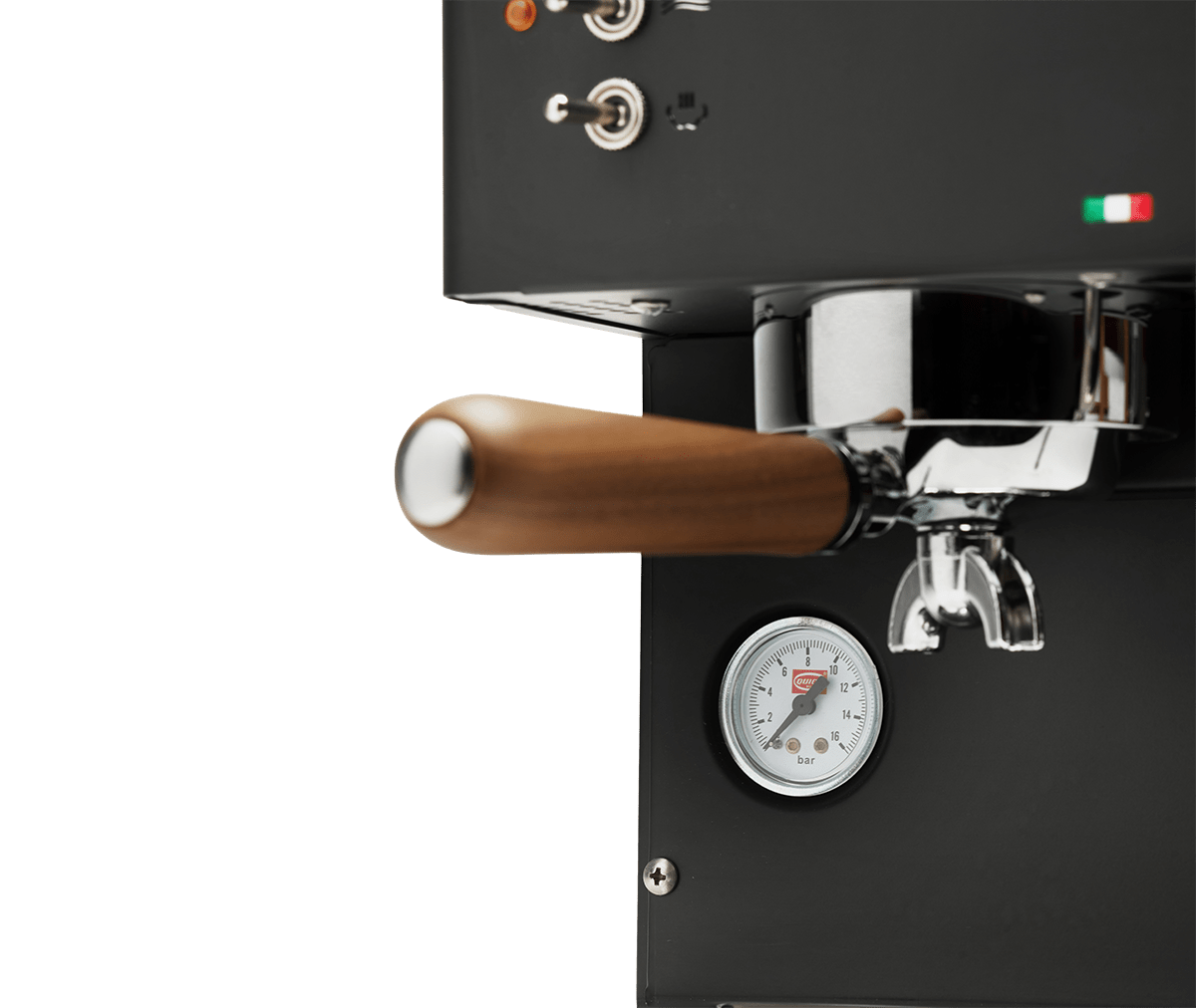Analogowy manometr (0–16 bar) pozwala na bieżąco obserwować ciśnienie parzenia. Ułatwia to regulację mielenia i dozowania, aby osiągnąć optymalne ciśnienie około 9 bar — klucz do zrównoważonego espresso.