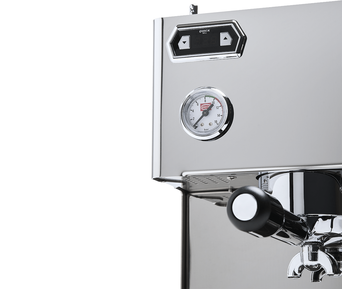 Manometr (0–16 bar) pokazuje dokładne ciśnienie pracy pompy, co pomaga optymalizować mielenie, dozowanie i ubijanie dla idealnego espresso.